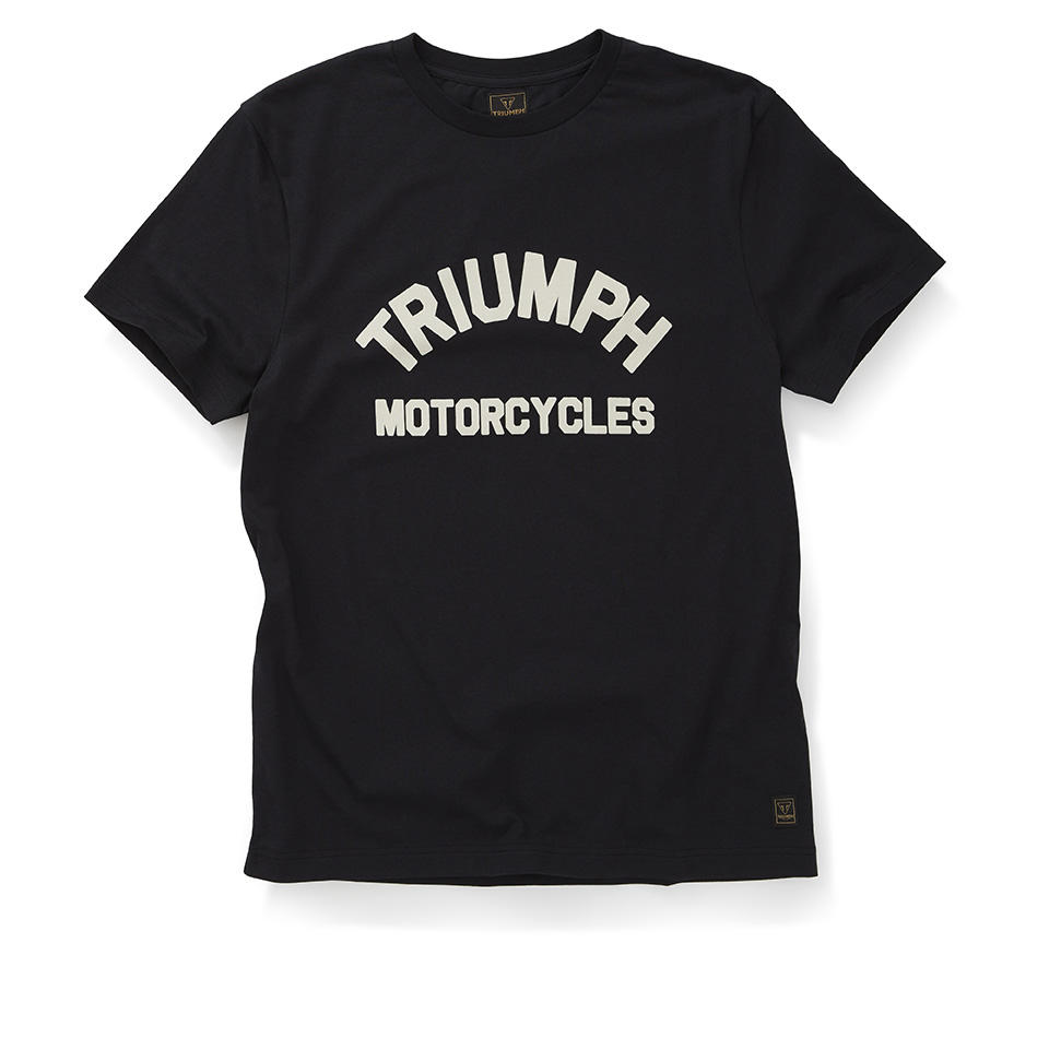 A Jet Black 160g weight cotton tee with stylised soft pigment arched Triumph Motorcycles lettering in Bone on the chest, and new signature Triumph-branded woven badge towards the lower hem.